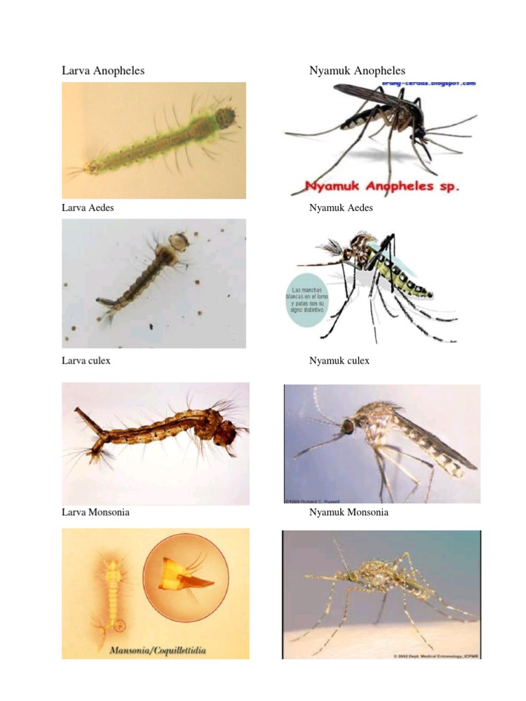 Kedua Culex dan Anopheles memiliki tubuh kurus dengan enam kaki sepasang sayap mengisap mulut dan sepasang mata majemuk. Efektivitas Ekstrak Daun Mundu Garcinia dulcis sebagai Larvasida Nyamuk Culex quinquefasciatus dan Aedes aegypti. Berbentuk sempit dan panjang.
