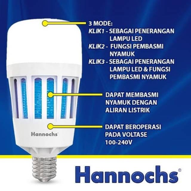 Hannochs Lampu LED Anti Nyamuk merupakan lampu LED dengan 2 fungsi yaitu sebagai lampu normal dengan cahaya putih berdaya 9 W dan sebagai pengusir nyamuk dengan cahaya kuning berdaya 6 W. Kami mempunyai berbagai lampu perangkap serangga untuk memenuhi kebutuhan bisnis Anda yang berbeda. - Sebagai lampu led biasa.