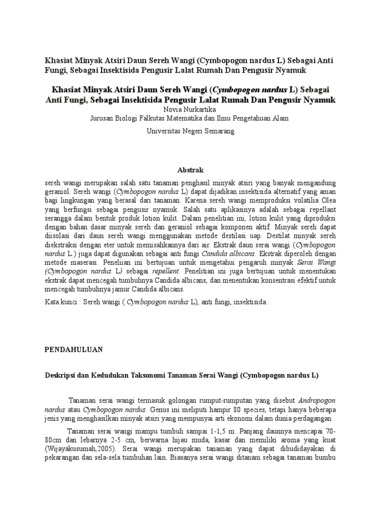 Jurnal Serai Sebagai Anti Nyamuk - Tanaman sereh wangi Cymbopongon nardus L merupakan sumber minyak atsiri yang diperoleh dengan cara ekstraksi. Sebagai Bahan Anti Nyamuk 1Beberapa tanaman berpotensi anti nyamuk a.