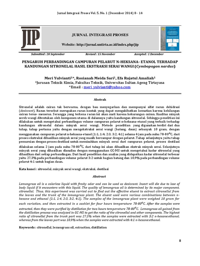 Jurnal serai sebagai anti nyamuk. Sereh wangi memiliki banyak manfaat. Sereh wangi mengandung minyak atsiri dengan komponen geraniol 20-40 citronellal 25-50 dan citronellol 10-15 yang menimbulkan aroma sehingga dapat digunakan sebagai repelen atau penangkal nyamuk. Dibandingkan tahun 2016 dengan kasus sebanyak 100347 serta IR 3980 terjadi peningkatan kasus pada tahun 2015.